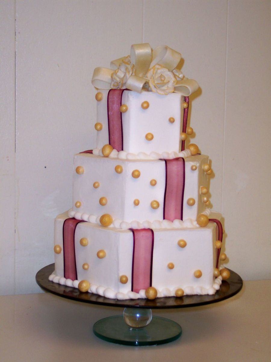 Short on time for a wedding show, I used ribbon and painted some fondant pearls I had with gold dust. Gumpaste bow with gumpaste roses edged in gold dust. Kind of funky, but I got a lot of positive comments on it. Go figure!