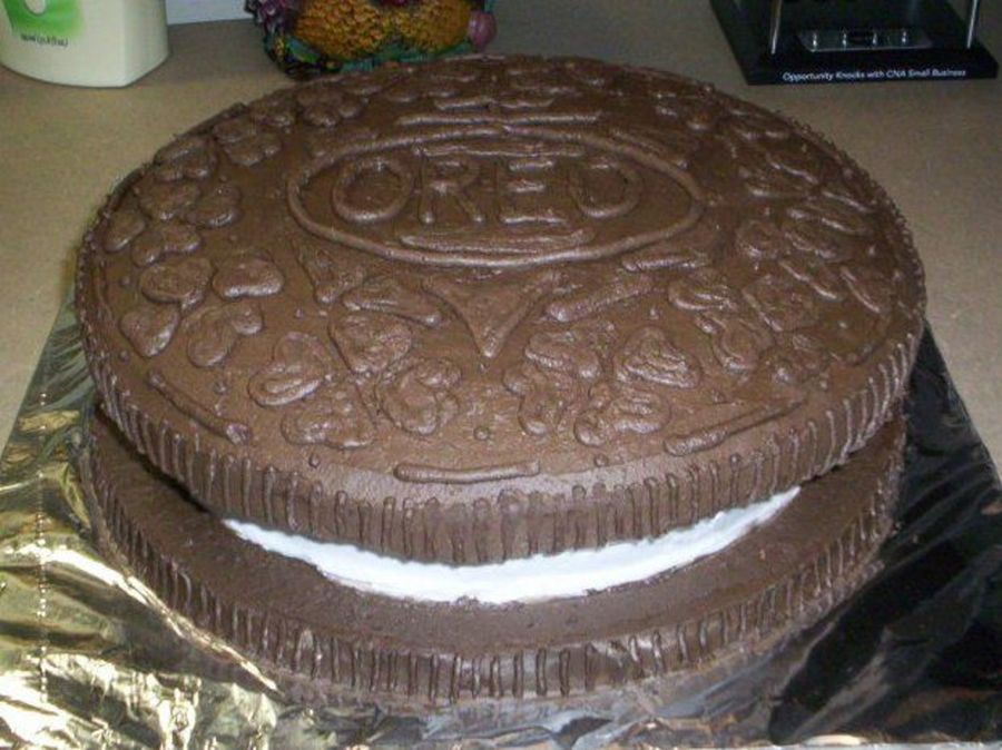 I did this cake for my manager who loves oreos. Took a 10" and cut it in two then put an 8" in between. Iced the bottom layer and the middle before putting on the top. Used chocolate buttercream that I made and a lot of oreos as models - some got eaten along the way.....