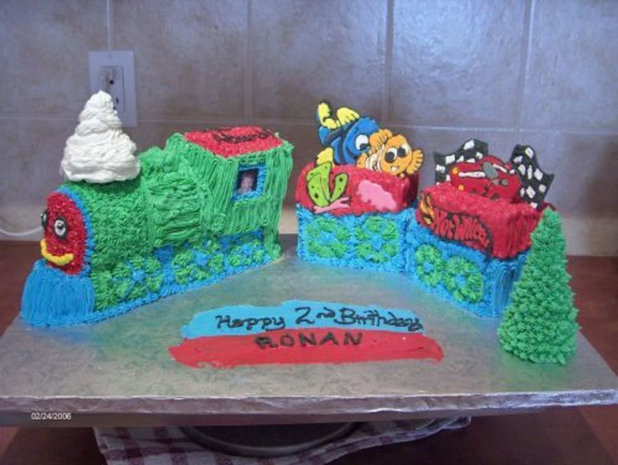 This is the 5th cake of this weekend going out! The mother wanted me to match the party invitation.I think there is too much green but I did what she asked.The nemo and hot wheels are royal icing transfers as she wanted me to incorporate the 2 things her little boys loves most!! I used the wilton 3d train pan and then carved the rest from regular cake for the railcars.