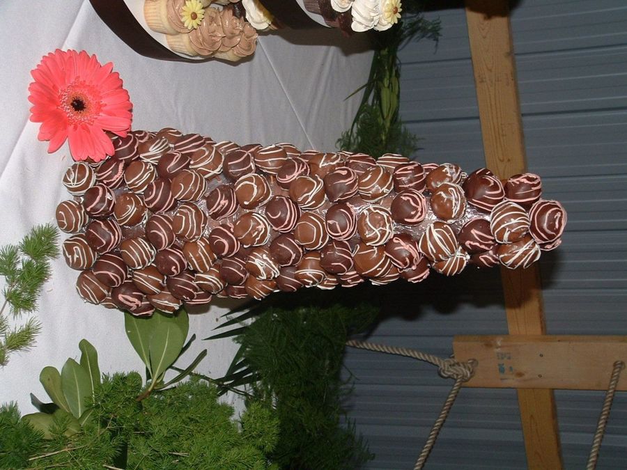I freeze my cakeballs and dip them with a toothpick. I let them cure on an egg carton so that they do not have a flat spot like a chocolate.I then prepuncture a floral foam pyramid and place the ball in the hole. I cover the floral foam with coloured celophane in this case pink since the wedding was brown & pink. I make my way all around varying flavours until I reach the top. I guess being a farm wedding I could have poked straw around it but it went over well. I have been making cake balls for yrs.
