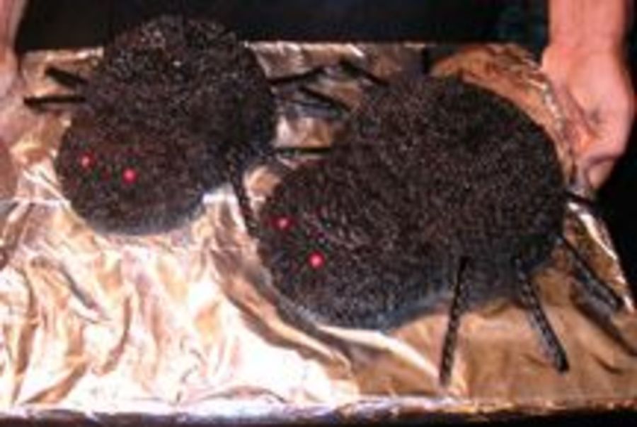 Got the idea from a cake book about a filled cake, baked the bodies in a glass pyrex bowl (didn't have a ball or domed shape pan), cut the cake in half, scooped out the middle and filled with red jello in one, green in the head, so when the cake was cut the spiders "bled". The kids loved it, Halloween is fun to do "gross-out" cakes for kids! The black frosting was flavored with cocoa over chocolate cake, and surprisingly cherry jello goes really well with cake!