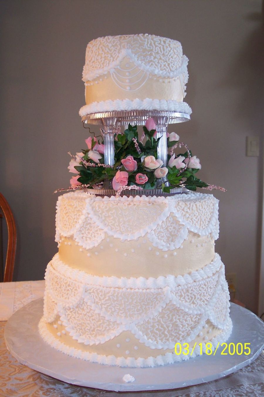The bride wanted something in ivory that looked like lace, so I did a flat ivory b.c. icing, with the white cornelli lace to contrast and get the desired effect.