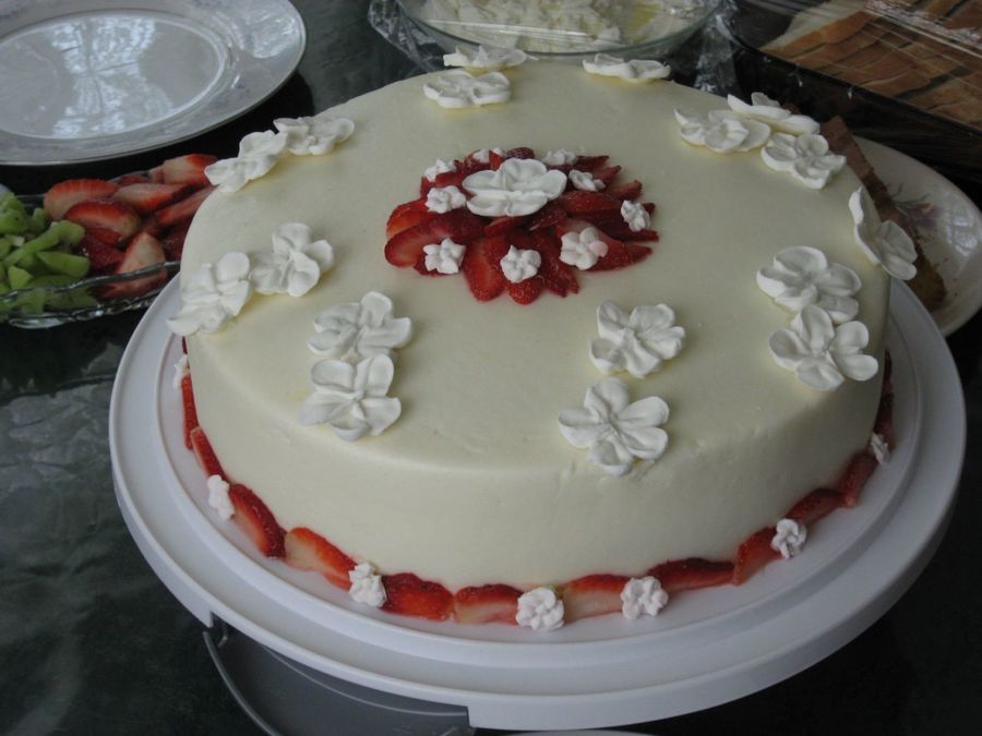 10" chocolate double layer cake with nutella/raspberry filling, covered in mint buttercream icing and royal icing dogwood flowers and sliced strawberries.