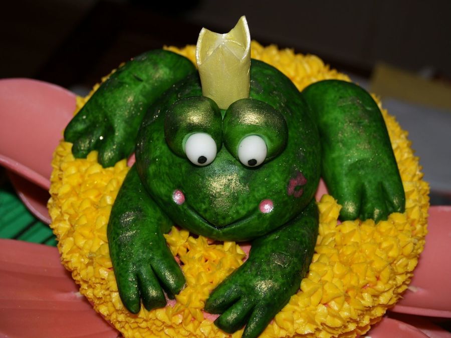 This little guy's been kissed, but he's still a frog.... Lot's I'd do different, I wish I had kept him the nice shade of green I had origionally tinted the fondant, he's a little too "overdone'. I think the tinted fondant looks more edible. I need to figure out something different next time with the crown as well. This is practice, and wasn't made for anyone, so live and learn.