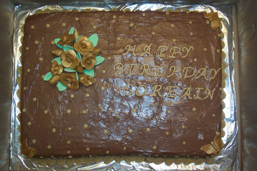 This was a chocolate cake with chocolate buttercream frosting. I made it for my daughter - in - law co-worker surprise birthday party that the theme was gold. I used gold dust to color the flowers and make the dots. The butterflies are made of fondants.