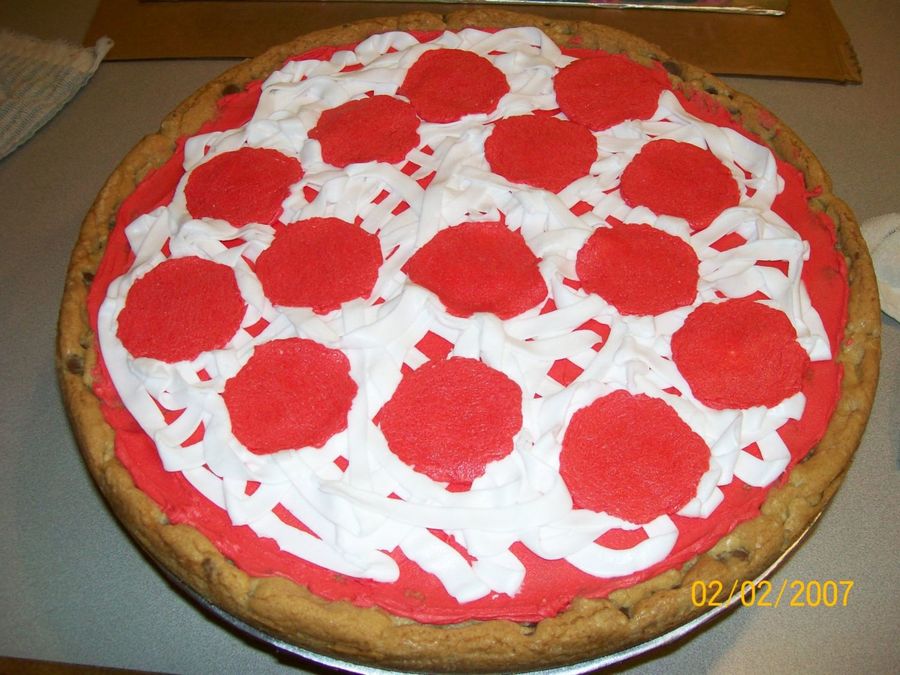 Pepperoni Pizza Cookie Cake for my nephew's birthday. "Crust" is chocolate chip cookie that I baked in a 14 inch round pan. Toppings done in buttercream. Unfortunately, he got the flu and didn't even get to have his party. Bummer!