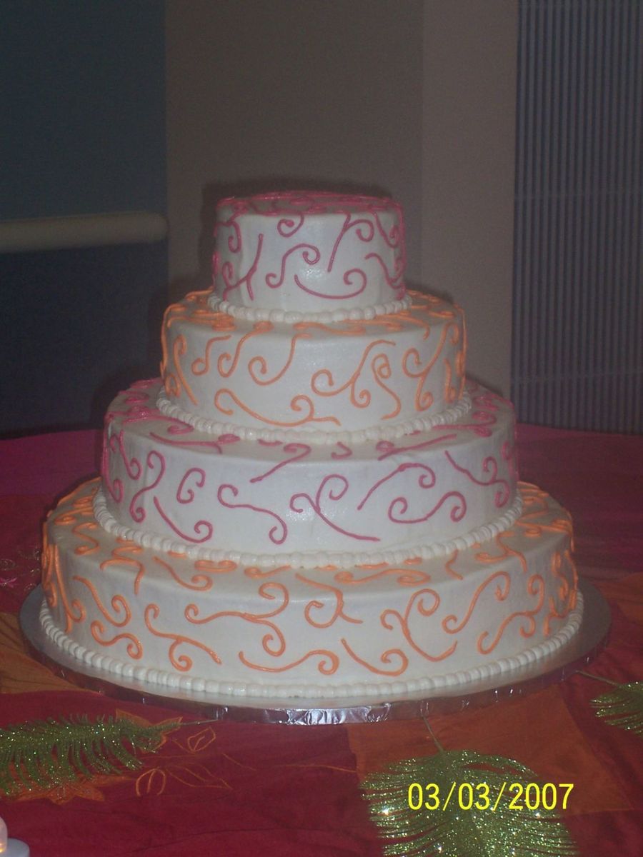 this cake was for a wedding done in bright tropical colors, when the bride told me she wanted scroll work done in orange and fuscia i thought that it would look a little weird, but once i put it on the table it fit right in.