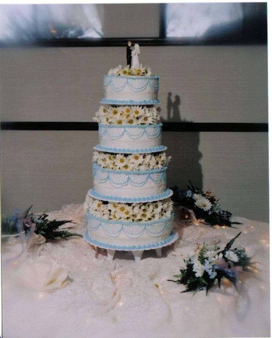 I think your cake is awesome. I've only tried a 2-tier and a 3-tier. I have a whole new appreciation for them. I love your colors and your daisies compliment so well. Great job!