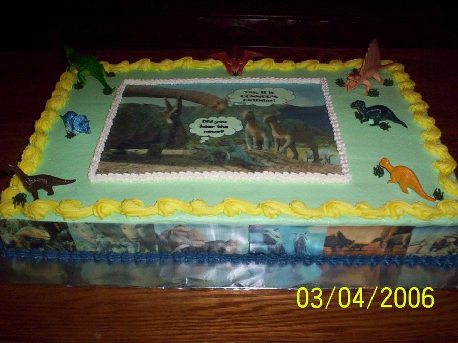 This a 1/2 sheet marble (yellow and Choc.) cake with b/c icing. On top and around the sides I have edible images. The dinosaurs on top are plastic toys. This cake had me stumped when the client first asked for a dinosaur cake. I wanted something different and I was somewhat pleased with the outcome....Thanks again for looking.....