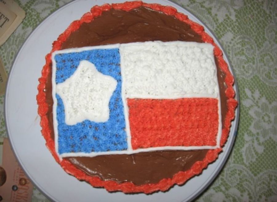 Firstly, I know this isnt 3-D but no other category fit! Secondly, I apologize for the sloppiness, this was done in a hurry (the cake was still warm!) but I wanted to show the idea. I made the star by using a cookie cutter as an imprint, and used a grater as a straight edge to make the flag. The colors are Wilton (the Cars set) I was going to add a yellow rose to tie in the Texas theme but I thought I liked the color scheme as it was.