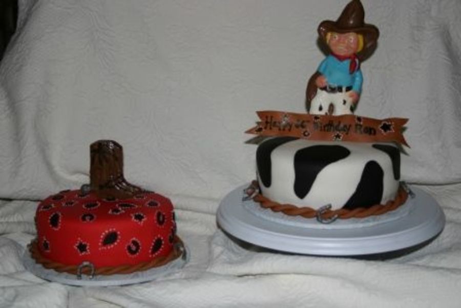 fondant covered cakes with chocolate boots and cowboy, and horseshoes