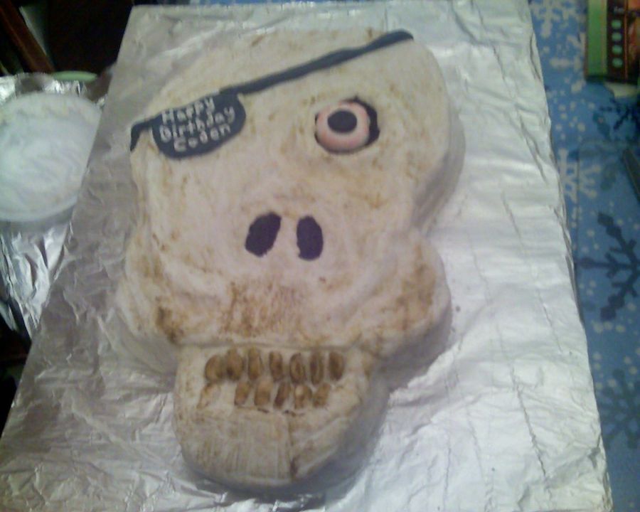This was for a little boy who wanted a skull for his birthday. This was the first one I have done. It is carved from a full sheet cake. The cake is white and iced with buttercream. I did not like it much, but they loved it.