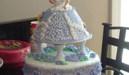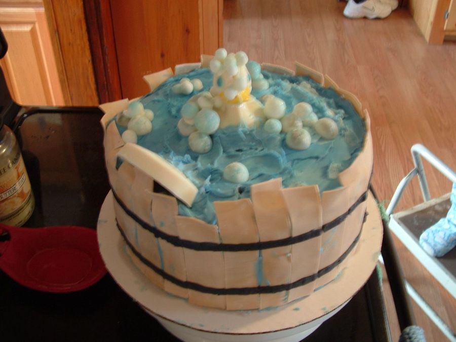 A non specific baby shower cake. A wash basin w/fondant bubbles and solid white chocolate bubble-ducky as we call it swimming in the middle. I fixed it up before it went out the door. I was running out of time and didn't want to forget the picture. It was a marble layer cake w/chocolate pudding filling, BC frosting and fondant as accents.