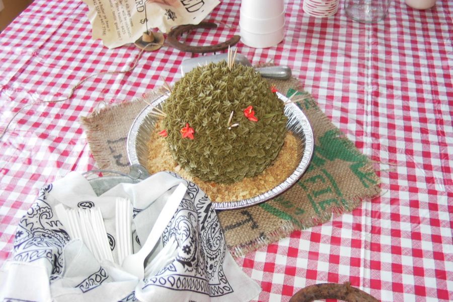 EASY, QUICK cake to compliment my daughters 3rd birthday pony cake. White cake made with Wilton sports ball pan. Iced with star tip and accented with fire orange flowers and toothpick thistles. Presented in pie tin with crushed cinnamon grahams or chocolate cookies.
