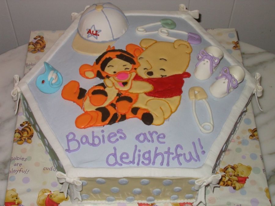 Buttercream icing with fondant hat, pins, pacifier, and booties. Colorflow pooh and tigger