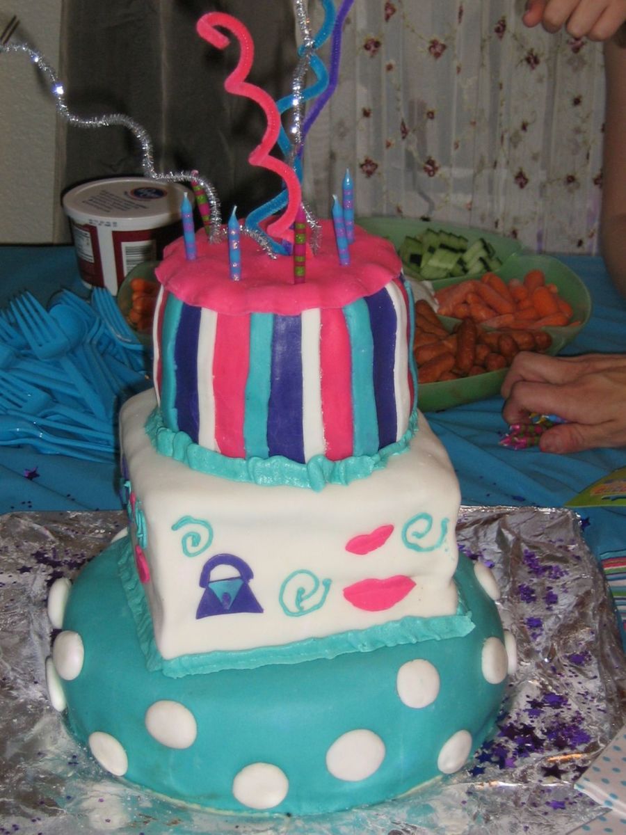 This was a two person cake; I helped my friend make this cake for her daughter's 7th birthday. The party was Bratz themed, but we stayed away from putting Bratz on teh cake, we just used the color scheme from teh plates and napkins etc. Then to tie it into the dolls we had purses and lips on the cake.