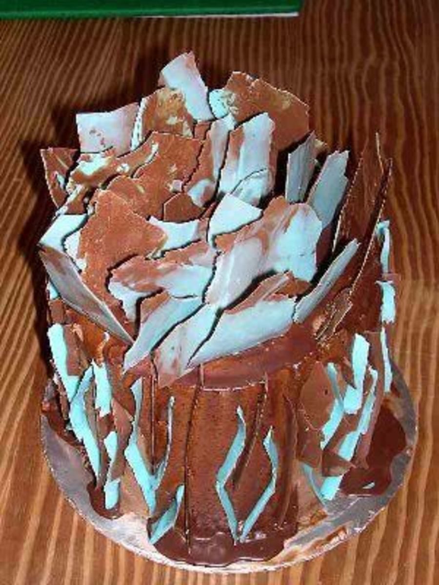 This was actually a "saved cake". It is a chocolate cake covered in chocolate buttercrea. The buttercream was giving me problems, so I covered it in a chocolate ganache and made blue & brown chocolate pieces and just stuck it in there.....my neighbor said that her family finished it off in 36 hours!1