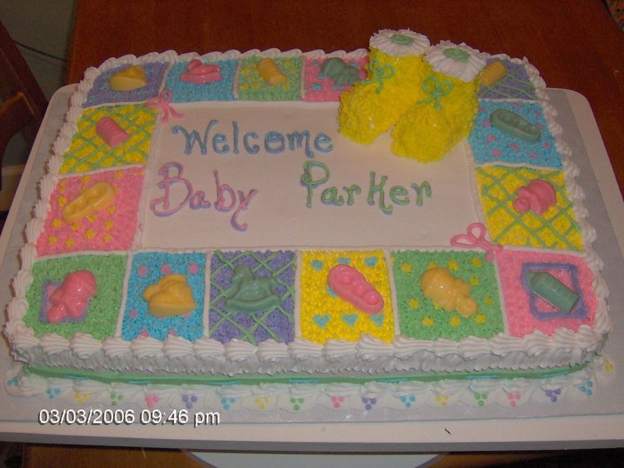 cindy6250 on 4 Apr 2006 , 7:43am Very cute cake. I love the borders, very nicely done. Also like the idea of making the booties from marshmallows.
