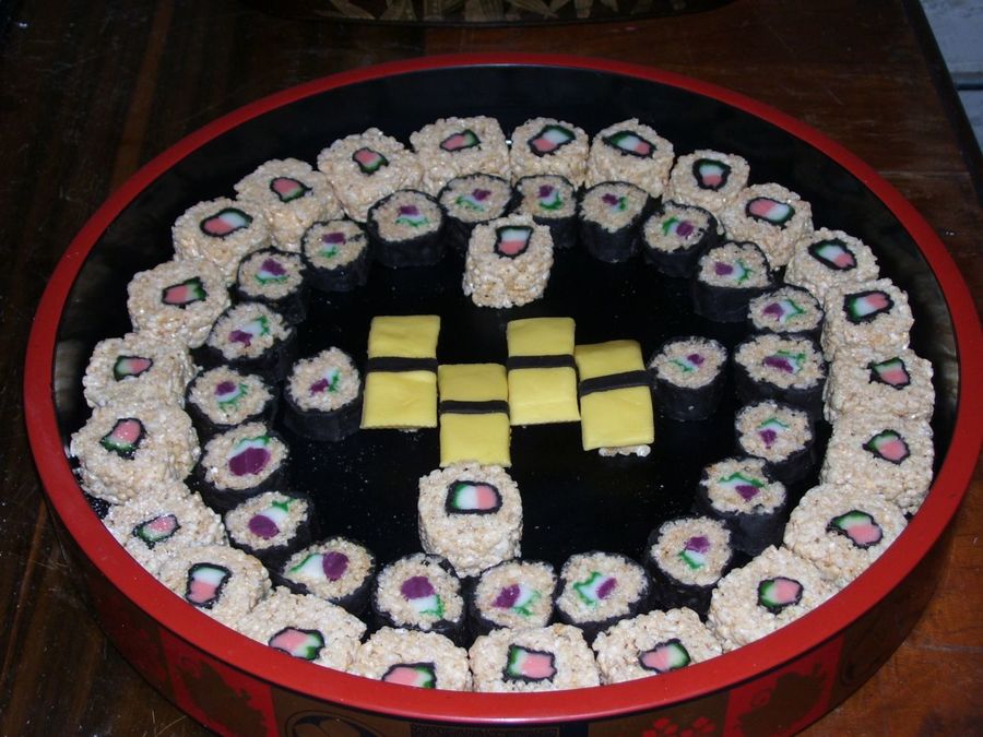 kenyatta4 on 9 Mar 2007 , 2:59pm Thanks! The fish/veggies and seaweed are made with tinted modeling chocolate and the "roe" are orange non pareils.