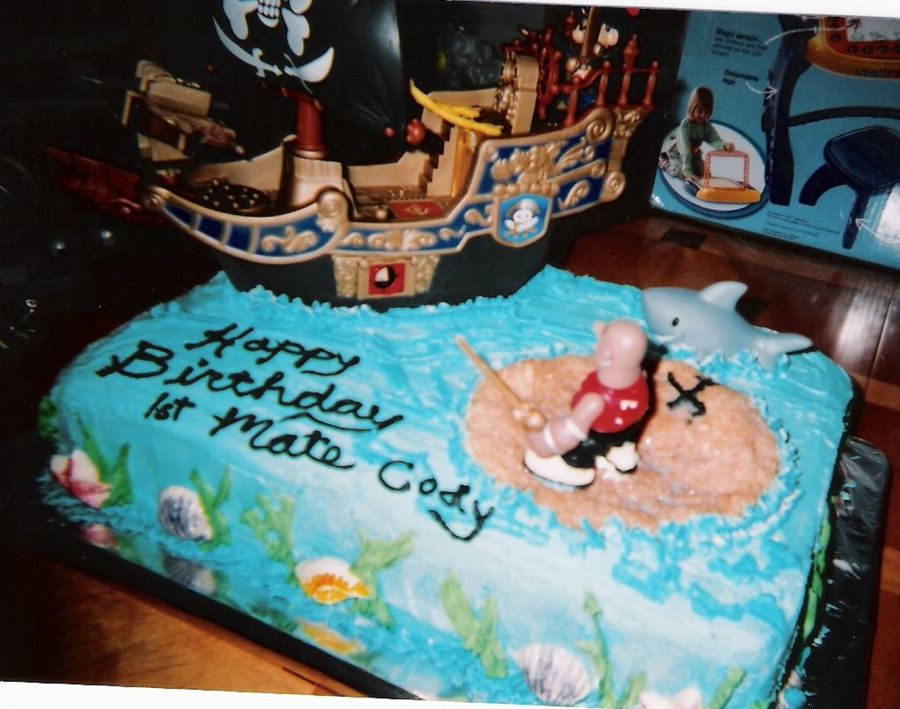 2 layer chocolate cake with cream cheese frosting. Pirate ship anf pirate are toys purchased for the cake. The island is a large cookie. The sea shells are molded from white chocolate.