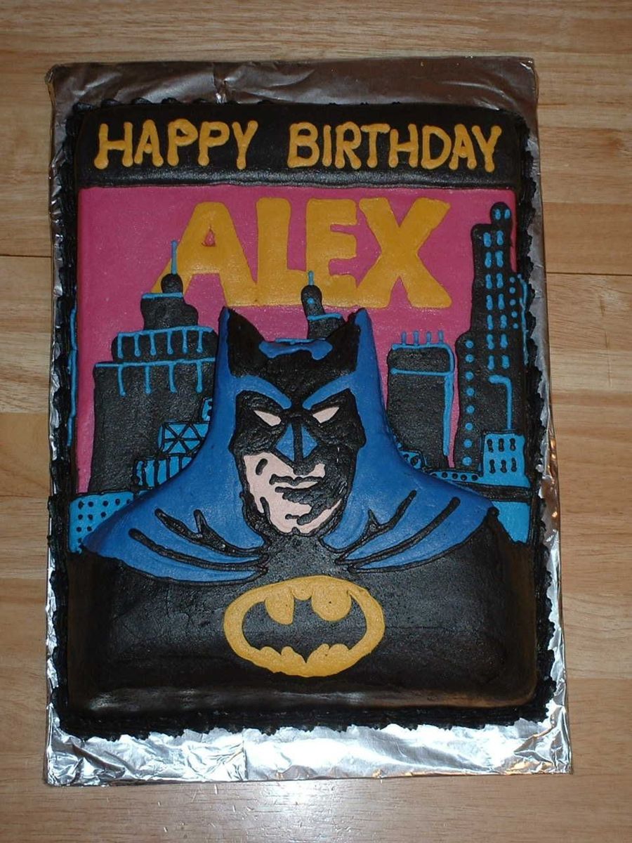 Batman/Gotham City cake done, a lady wanted a magazine cover copied. Used the wacky cake recipe for allergic customer (no eggs, milk). Base cake is 11x15 and Batman is cut out of additional 9x13 so its raised up.