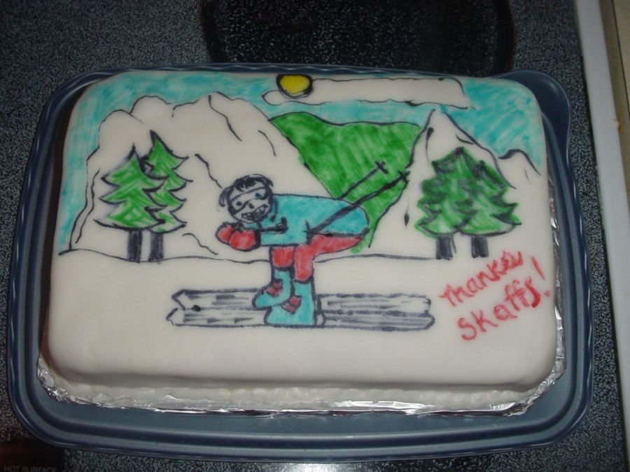 Tried to copy BonJoviBabe's cake, but as you can see did not go so well. I was going to paint with pasted, but thought I could draw the outlines first with edible markers, but if you look at the trees on the right when I went to paint the edible marker ran, so I ended up using all marker. Good news: I used Toba Garret Rolled Fondant recipe and loved it. Thanks. CMarkins.