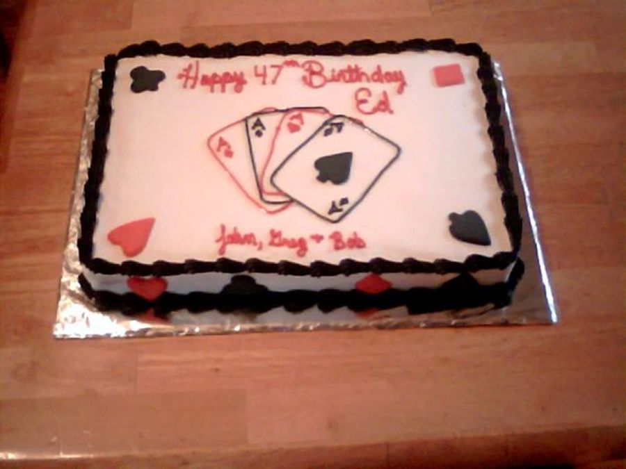 A Vanilla cake, buttercream icing, royal icing for the candy suits. Slightly different from my other one, I arranged the top suits in the corners at an angle on this one.