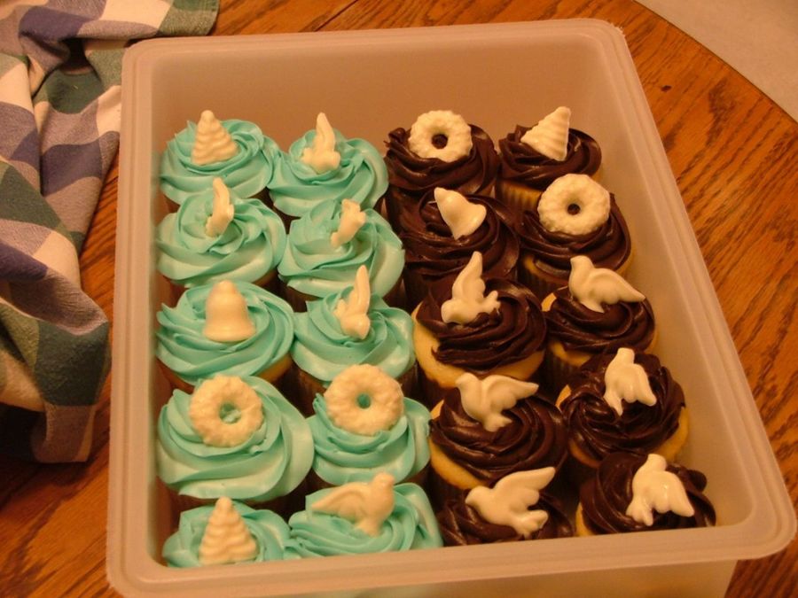 These are a set of cupcakes that I made for a holiday work party. The tops were made from using white chocolate and molds.