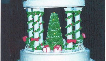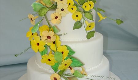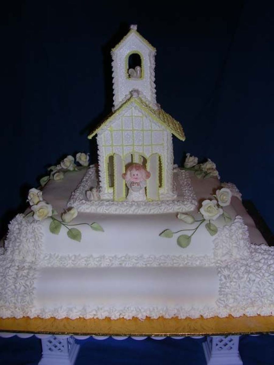 Here is a picture of the cake I made for a First Communion. It is covered with fondant and decorated with yellow buttercream. The church and flowers are made from pastillage.