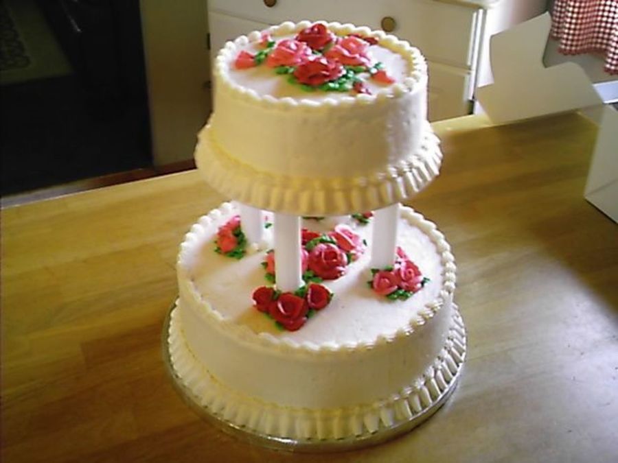 All buttercream icing, 12in and 8in. rounds. Bride just wanted red and dark pink roses on the cake, nothing fancy. She wasn't even putting a topper on it, and all the cake was to be served so I went with the 8in for the top tier