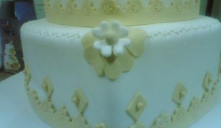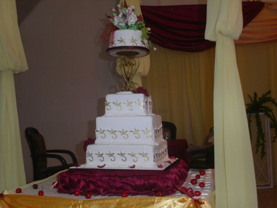 This is a combination of stacked cakes and single. The colors of the day were wine and gold. The side design was made from a mould and dusted in gold colour. The flowers are all fondant. I used wine coloured grapes i bought from a shop. The stand is made from wood and I covered it with wine pleated satin fabric. It turned out beautiful.