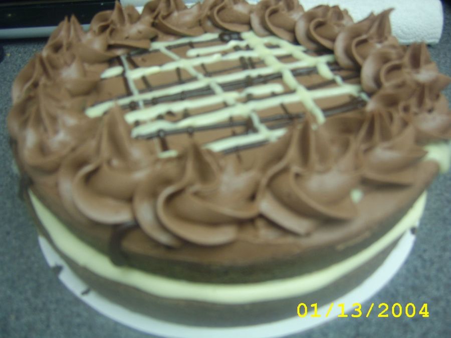 two layers of brownies baked in my 9 inch cake pans, cream cheese filling in the middle, chocolate buttercream on top drizzled with semi-sweet and white chocolate. Picture is from 3/9/2007