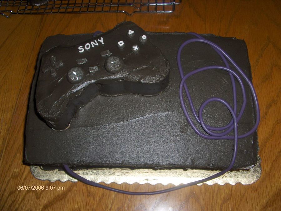 This cake was so much fun. The guy that I did this for was a gaming fannatic. His friends said that was all he ever did. So I took a few measurments off of my husbands PS2 and made the cake. The cord was pull n peel licorice.