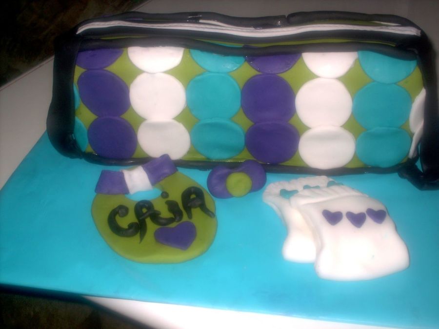 Designer diaper bag cake made from vanilla pound cake with vanilla buttercream. This cake is covered in fondant and the bag comes complete with fondant accessories which include, personalized baby bib, pacifier and cute little baby diapers.