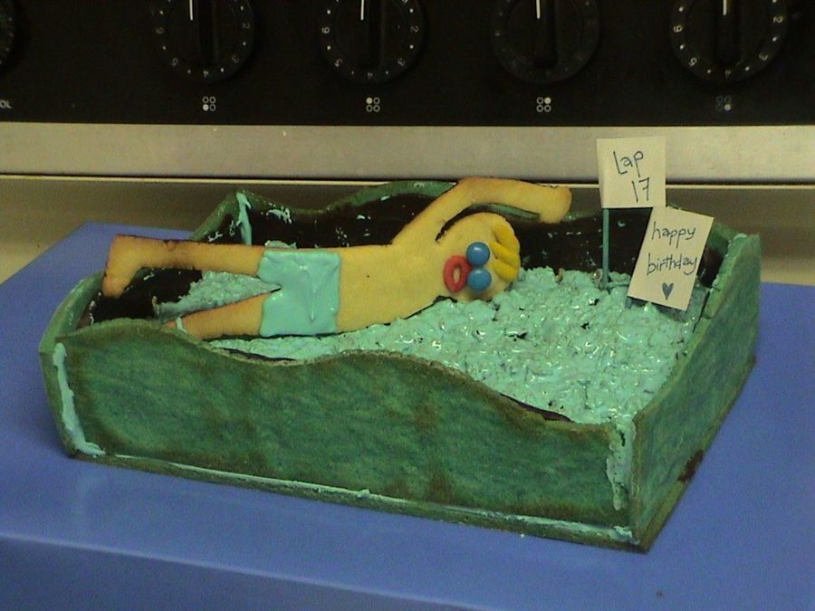 Blue sugar cookie dough glued together with royal icing (and strengthened with melted chocolate on one side of each cookie) then filled with cornflakes mixed with marshmallow creme (dyed blue), complete with a cookie swimmer! For my brother-in-law's birthday and a horrible representation of the image of what it would look like in my mind! I am tempted to try again and do better.