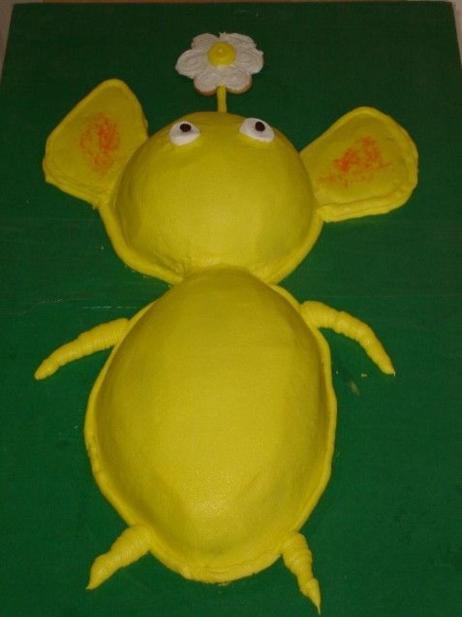 Cream cheese cake covered in Cream Cheese icing. Made him for my sons birthday, he loves the Nintendo game. Used a football pan for the body, sports ball for the head and cookies for the ears and flower. Thanks for looking.