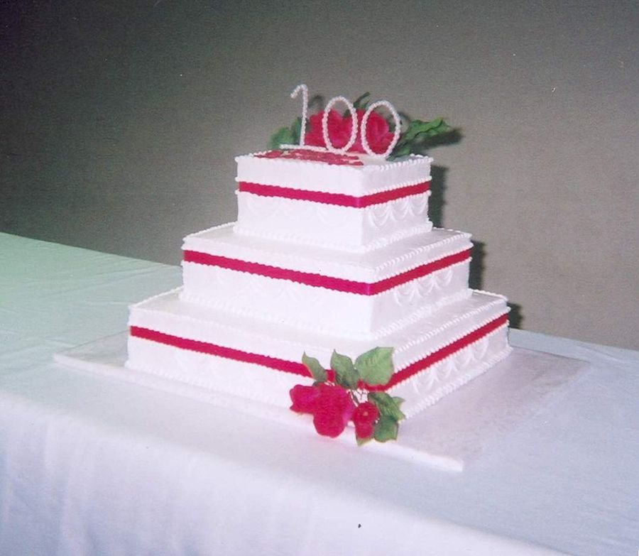 This was for a sweet little lady turning 100. You can't see all of the detail, but it was a very pretty cake. It has a dark pink ribbon and dark pink silk flowers. The ribbon and cake was trimmed with white b/c icing bead borders. The 100 was done with floral wire and platback pearls glued together.