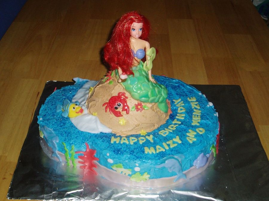 vanilla cake with buttercream and fondant decorations. it was (2) 12" rounds, 1 wilton doll cake pan with doll pick, i swapped out the head from my daughter's ariel doll! i also added on (1_ 8" roun cut in half and sculpted to fit onto the side of the 12" rounds to make more of a lagoon effect.