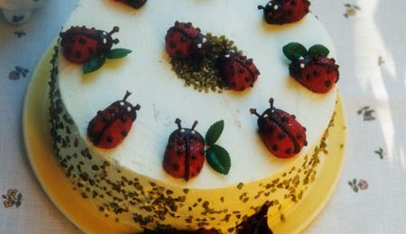 Thanks, the cover and roses are pure colored marzipan, and cake is 2 layers of Genovese sponge, 2 layers pr raspbery jam, layer or vanilla cream, and layer or pure cream.