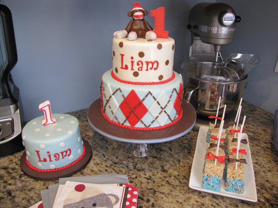 This sock monkey cake was for a little boy's first birthday. The sock monkey is made out of a fondant/gumpaste mix.