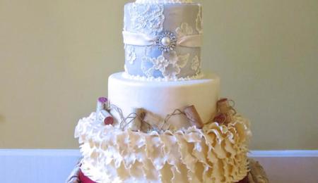 This is a round wedding cake I did for a sorority sister. All the roses are handcrafted with some dusted in old gold lustre dust and some left completely matte. There is also a crown border and brushed embroidery featured on this cake. Hope you enjoy!