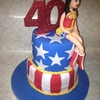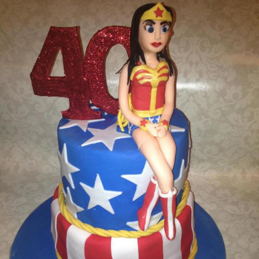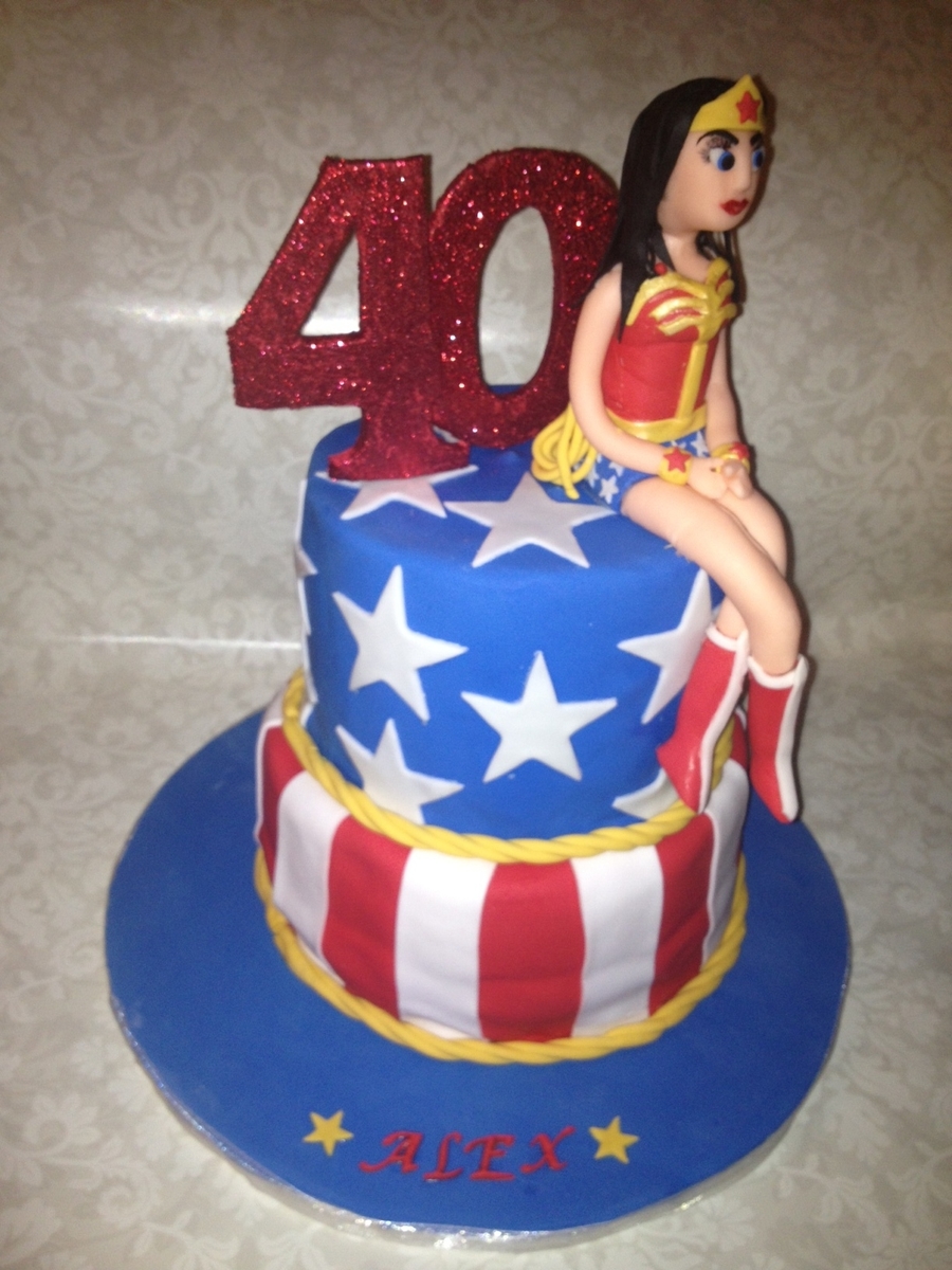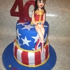 This my first fondant cake. This is a design I found online and loved it for my sister and replicated it from cakesbyraywyn..Thanks..I hand sculpted Wonder woman and the numbers, which have red disco dust on them. The top tier is an almond cake covered in white chocolate ganache and the bottom is a decadent chocolate with dark chocolate ganache. It is my first human hand sculpted figure, 3rd figure ever sculpted..I am self taught baker and custom cake designer, I am loving this new art form :) (full time Assistant and mom of a 17 month old, she follows me around saying cake :)