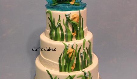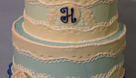 Lemon Chiffon cake with orange buttercream filling covered in MMF. Studs on Tuxedo are candy. Topper is Disney Mickey and Minnie in Crystal. Candy pearls cover the back half of the top tier.