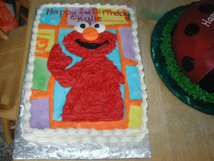 I used spray food color for the background then just used a 5 tip and 8 tip for fill in. I used a fork to add the texture on Elmo.