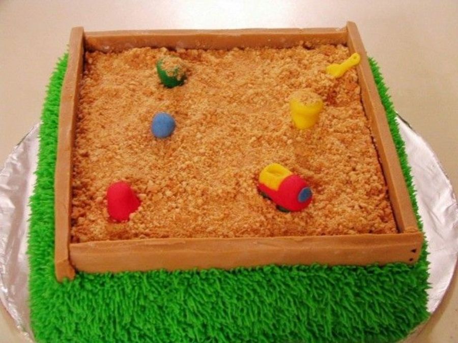 The toys and boards are all fondant, sand is crushed cookies. The grass took me forever!