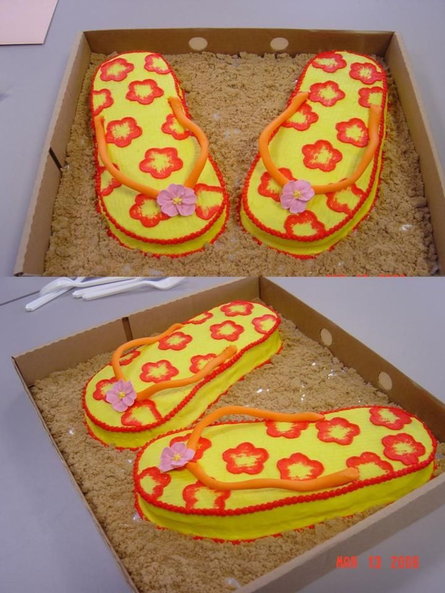 Thank you BJ for this wonderful idea. My officce wanted a cake to celebrate our supervisors birthday. I had no idea what to make her until I ran across pictures of flip flops. My supervisor is a HUGE fan of flip flops and loved these cakes. It was a chocolate mayo cake with buttercream icing. The straps are fondant and the sand is brown sugar.