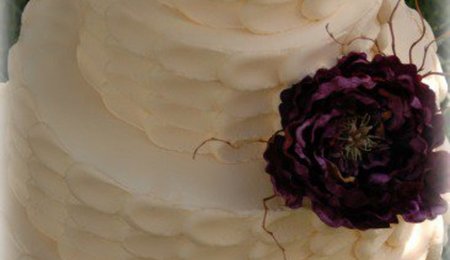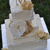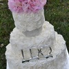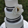 6-9-12 (tall top and middle tier), top tier is buttercream with navy fondant stripes, middle tier is buttercream encrusted with sugar and bottom tier is covered in navy fondant; the flowers are silk. This is a display cake.
