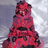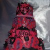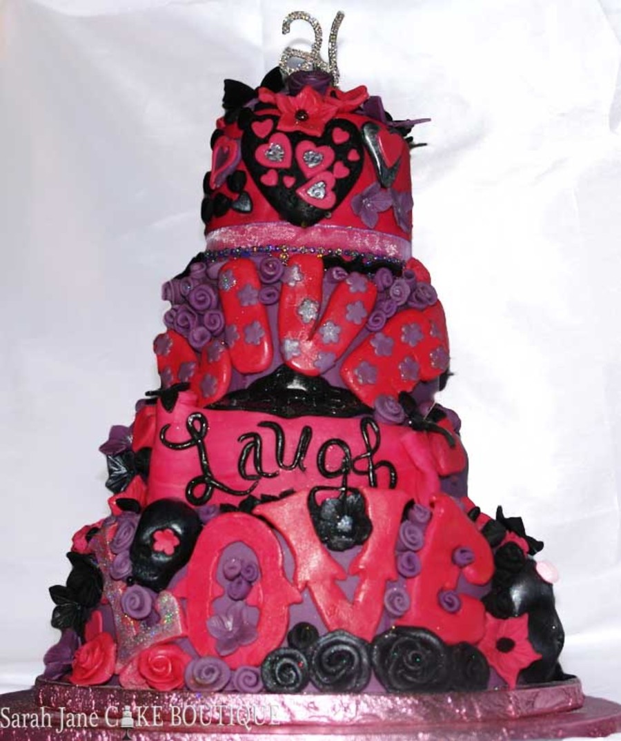 21st Birthday pink purple black live laugh love cake, four tiers of chocolate and red velvet filled with a whipped rich chocolate ganache then smoothed with ganache and covered with marshmallow fondant.
