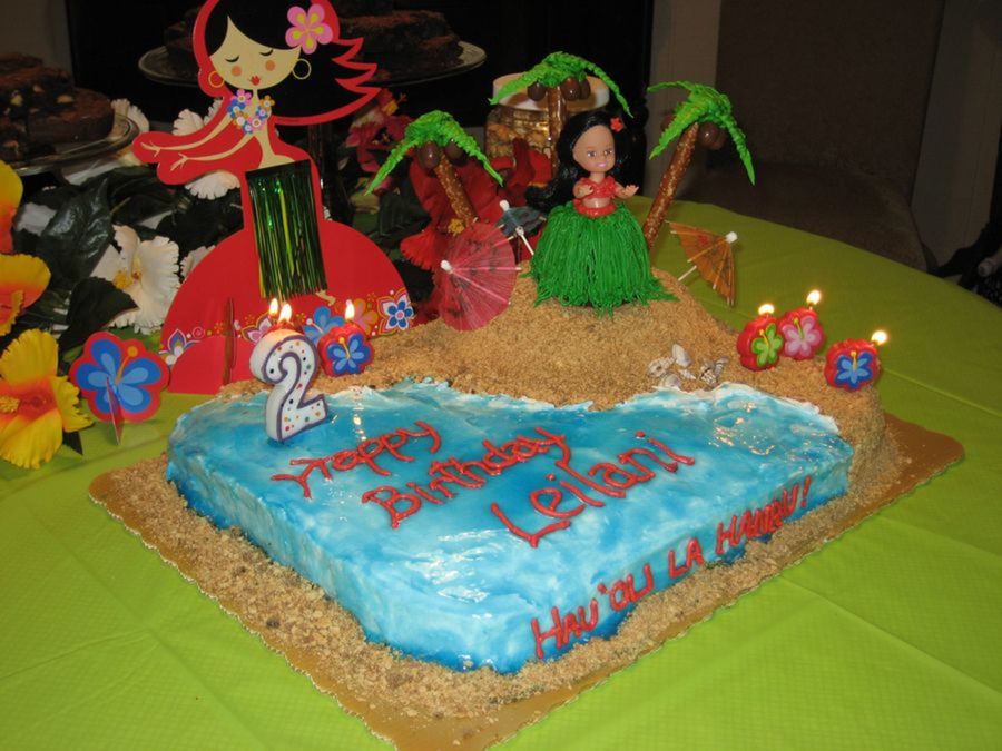 Thanks! I used a combination of crushed graham crackers and brown sugar for the sand. The rectangle is white cake with pineapple filling, and the island and grass skirt are chocolate cake.