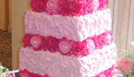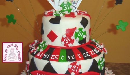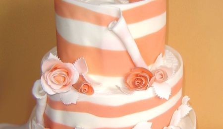 This nautical-themed wedding cake has tiers with lovely symbols of direction, future, stability, and infinity tied together with a rope in the wedding-color green. Cake itself is just buttercream. Decorations and rope hand-made from fondant. Topper is a wooden ship.